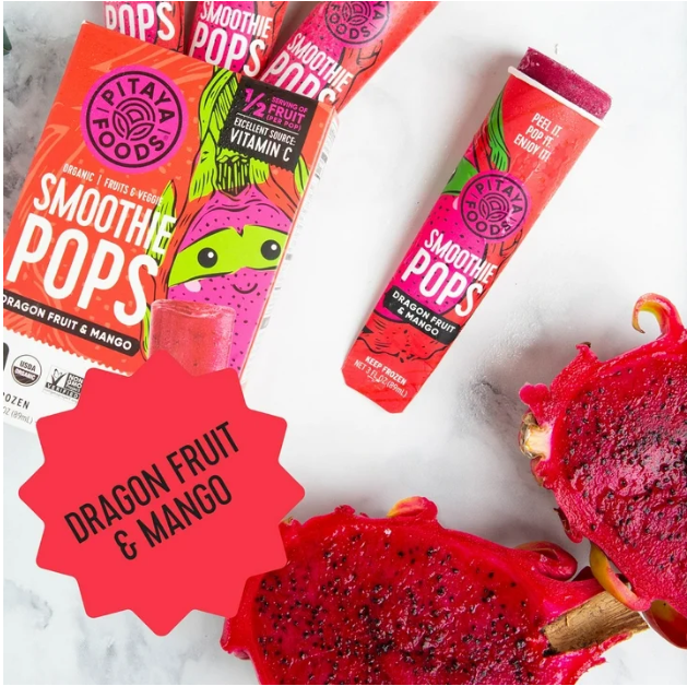 Frozen smoothie pops made with organic dragon fruit, mango, and real veggies