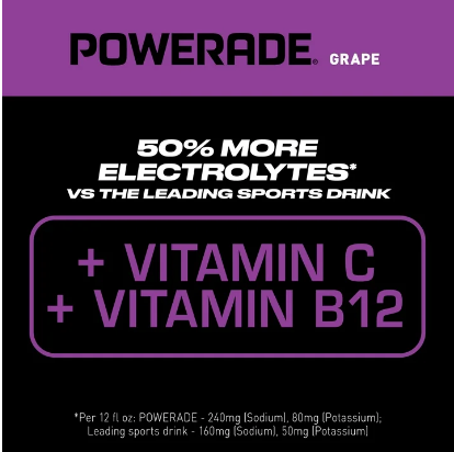 When it comes to achieving your goals, it takes more than just effort - it takes determination, grit, and the right kind of hydration. That's where POWERADE Grape steps in. This isn't just any sport drink; it's a hydration powerhouse. With 50% more electrolytes versus the leading sports drink*, POWERADE helps ensure you stay fueled and ready to conquer every challenge thrown your way. Packed with essential electrolytes, POWERADE is designed to hydrate and replenish you during and after intense workouts. The formula quickly replaces fluids and electrolytes lost through sweat, making it the ideal hydration drink for athletes who demand the best. Plus, POWERADE has Vitamin C to help support energy metabolism and Vitamin B12 to help support normal immune function. These electrolyte drinks help keep your body in top condition, so you can focus on your performance without any distractions. Whether you're powering through a tough training session or you need a post-workout recovery drink, POWERADE Grape delivers great taste and hard-working hydration. It's the go-to sports drink for athletes on the go, ensuring you stay hydrated and fueled-up no matter where your journey takes you. Remember, it takes more to be the best, and with POWERADE, you've got the hydration and support you need to realize your goals. *Per 12 fl oz: POWERADE - 240mg (Sodium), 80mg (Potassium); Leading sports drink - 160mg (Sodium), 50mg (Potassium)