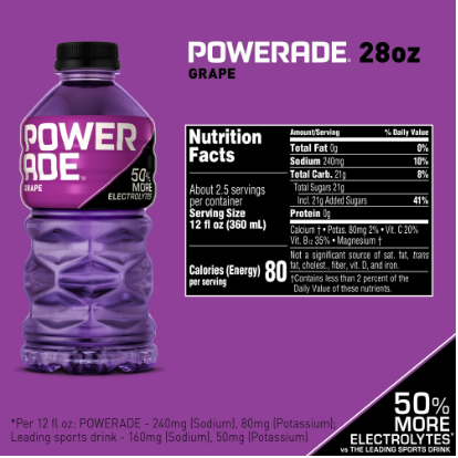 - Outmuscle and replenish - POWERADE electrolyte drinks contain 50% more electrolytes versus the leading sports drink [Per 20 fl oz: POWERADE - 400mg (Sodium), 130mg (Potassium); Leading Sports Drink - 270mg (Sodium), 80mg (Potassium)]