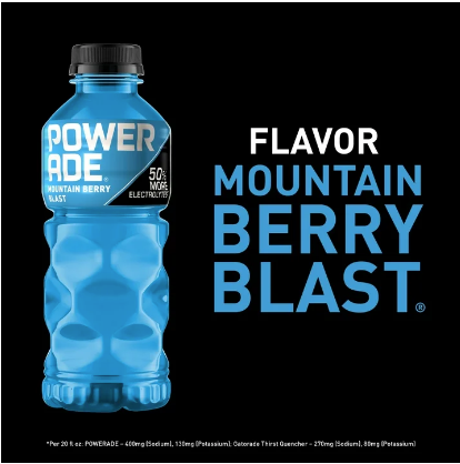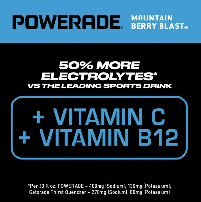 When it comes to achieving your goals, it takes more than just effort - it takes determination, grit, and the right kind of hydration. That's where POWERADE Mountain Berry Blast steps in. This isn't just any sport drink; it's a hydration powerhouse. With 50% more electrolytes versus the leading sports drink*, POWERADE helps ensure you stay fueled and ready to conquer every challenge thrown your way. Packed with essential electrolytes, POWERADE is designed to hydrate and replenish you during and after intense workouts. The formula quickly replaces fluids and electrolytes lost through sweat, making it the ideal hydration drink for athletes who demand the best. Plus, POWERADE has Vitamin C to help support energy metabolism and Vitamin B12 to help support normal immune function. These electrolyte drinks help keep your body in top condition, so you can focus on your performance without any distractions. Whether you're powering through a tough training session or you need a post-workout recovery drink, POWERADE Mountain Berry Blast delivers great taste and hard-working hydration. It's the go-to sports drink for athletes on the go, ensuring you stay hydrated and fueled-up no matter where your journey takes you. Remember, it takes more to be the best, and with POWERADE, you've got the hydration and support you need to realize your goals. *Per 12 fl oz: POWERADE - 240mg (Sodium), 80mg (Potassium); Leading sports drink - 160mg (Sodium), 50mg (Potassium)