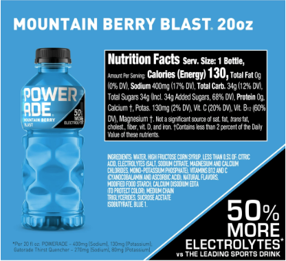 - Outmuscle and replenish - POWERADE electrolyte drinks contain 50% more electrolytes versus the leading sports drink [Per 20 fl oz: POWERADE - 400mg (Sodium), 130mg (Potassium); Leading Sports Drink - 270mg (Sodium), 80mg (Potassium)]