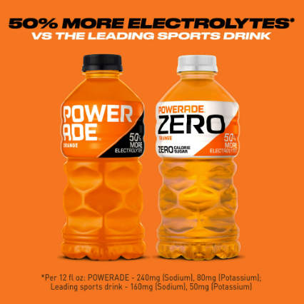- Outmuscle and replenish - POWERADE electrolyte drinks contain 50% more electrolytes versus the leading sports drink [Per 20 fl oz: POWERADE - 400mg (Sodium), 130mg (Potassium); Leading Sports Drink - 270mg (Sodium), 80mg (Potassium)]