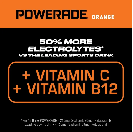 When it comes to achieving your goals, it takes more than just effort - it takes determination, grit, and the right kind of hydration. That's where POWERADE Orange steps in. This isn't just any sport drink; it's a hydration powerhouse. With 50% more electrolytes versus the leading sports drink*, POWERADE helps ensure you stay fueled and ready to conquer every challenge thrown your way. Packed with essential electrolytes, POWERADE is designed to hydrate and replenish you during and after intense workouts. The formula quickly replaces fluids and electrolytes lost through sweat, making it the ideal hydration drink for athletes who demand the best. Plus, POWERADE has Vitamin C to help support energy metabolism and Vitamin B12 to help support normal immune function. These electrolyte drinks help keep your body in top condition, so you can focus on your performance without any distractions. Whether you're powering through a tough training session or you need a post-workout recovery drink, POWERADE Orange delivers great taste and hard-working hydration. It's the go-to sports drink for athletes on the go, ensuring you stay hydrated and fueled-up no matter where your journey takes you. Remember, it takes more to be the best, and with POWERADE, you've got the hydration and support you need to realize your goals. *Per 12 fl oz: POWERADE - 240mg (Sodium), 80mg (Potassium); Leading sports drink - 160mg (Sodium), 50mg (Potassium)