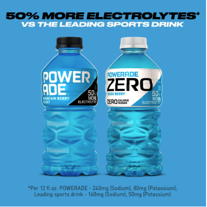 - Outmuscle and replenish - POWERADE electrolyte drinks contain 50% more electrolytes versus the leading sports drink [Per 20 fl oz: POWERADE - 400mg (Sodium), 130mg (Potassium); Leading Sports Drink - 270mg (Sodium), 80mg (Potassium)]