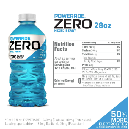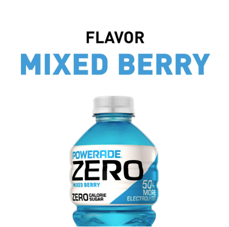 When you're pushing your limits, it takes more than just willpower to succeed - it takes the right kind of hydration. POWERADE Zero Mixed Berry sports drinks are here to power your drive with zero sugar and zero calories, so you can stay focused on your goals without compromise. This isn't just any sports drink; it's a functional hydration drink packed with 50% more electrolytes versus the leading sports drink*, designed to keep you hydrated and at the top of your game. POWERADE Zero Mixed Berry is formulated to help you hydrate, whether you're powering through a tough workout or you need a post-workout drink. With a formula that replaces the fluids and electrolytes lost during intense exercise, this hydration drink ensures you're always ready for more. Plus, with added Vitamin C and Vitamin B12, POWERADE helps replenish these vital nutrients to keep your body in peak condition. For athletes who demand the best, POWERADE Zero Sugar Mixed Berry electrolyte drinks deliver great taste and essential hydration on the go. This zero-sugar sports drink is your ultimate companion, providing the electrolyte support you need to stay ahead of the game. Remember, it takes more to be the best, and with POWERADE Zero Mixed Berry, you've got the hydration and support to reach your goals. *Per 12 fl oz: POWERADE - 240mg (Sodium), 80mg (Potassium); Leading sports drink - 160mg (Sodium), 50mg (Potassium)