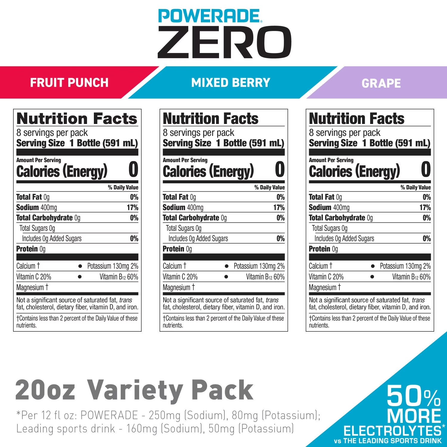 POWERADE Zero Variety Pack is formulated to help you hydrate, whether you're powering through a tough workout or you need a post-workout drink. With a formula that replaces the fluids and electrolytes lost during intense exercise, this hydration drink ensures you're always ready for more. Plus, with added Vitamin C and Vitamin B12, POWERADE helps replenish these vital nutrients to keep your body in peak condition.