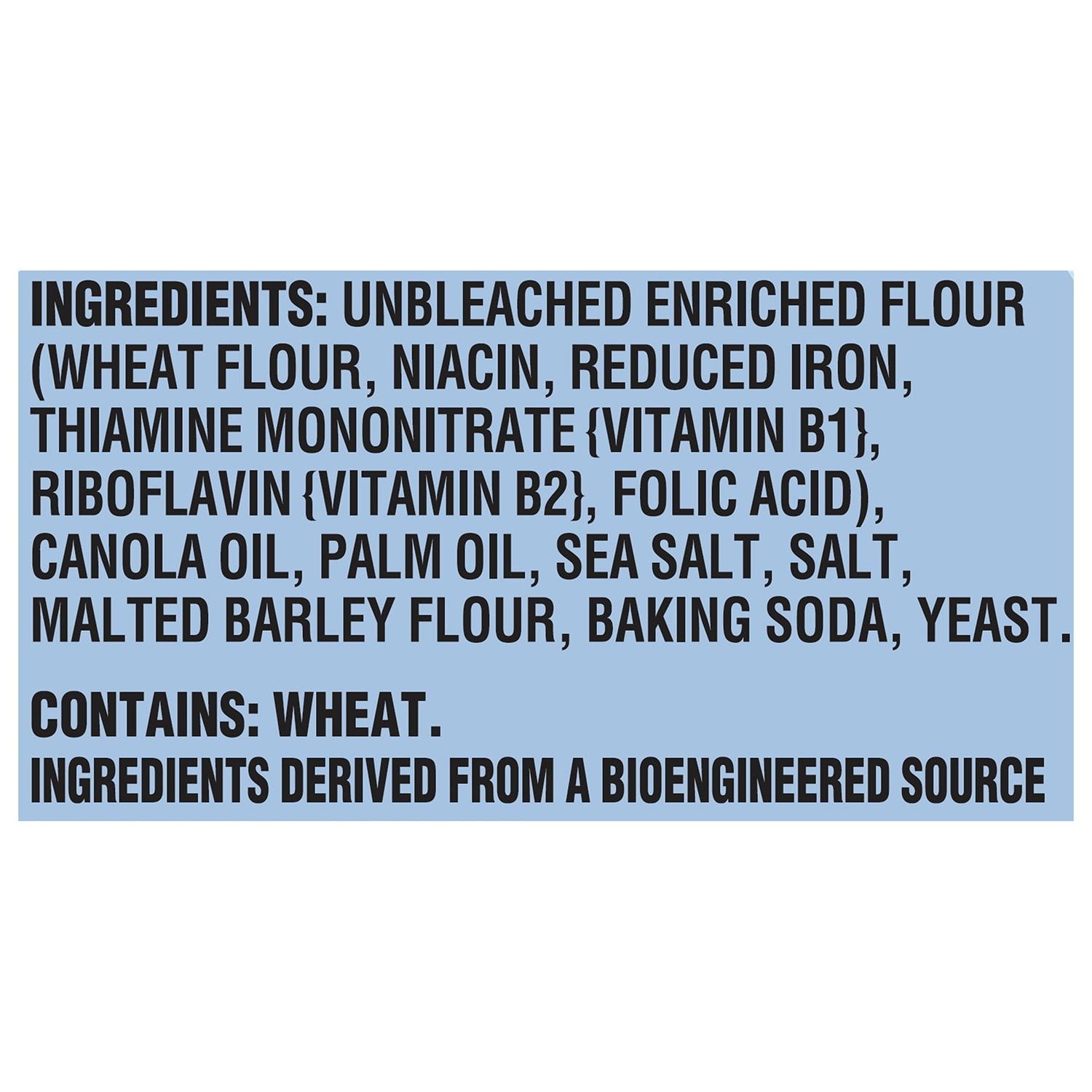 Ingredients: Unbleached Enriched Flour (Wheat Flour, Niacin, Reduced Iron, Thiamine Mononitrate {Vitamin B1}, Riboflavin {Vitamin B2}, Folic Acid), Canola Oil, Palm Oil, Sea Salt, Salt, Malted Barley Flour, Baking Soda, Yeast. Contains Wheat. Ingredients derived from a bioengineered source.