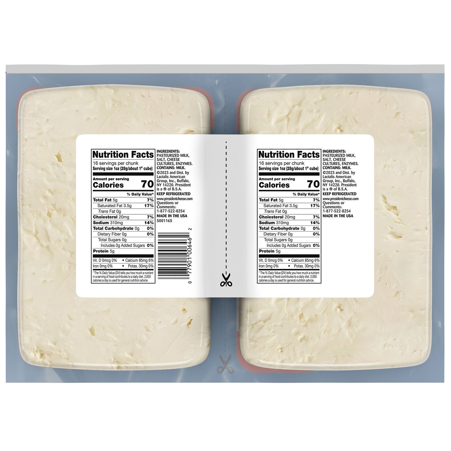 President makes feta cheese with healthy ingredients that can offer potential benefits. President Feta cheese also has calcium, which is an important mineral that the human body needs. One serving of fresh feta cheese has zero grams of trans fat, zero grams of carbohydrates and zero grams of sugar. There are also five grams of protein in every serving, making this a good source of an essential macronutrient. Lastly, each serving is only 70 calories, so it's easy to fit this into your day. This cheese contains milk that comes from cows that didn't receive any growth hormone treatment.