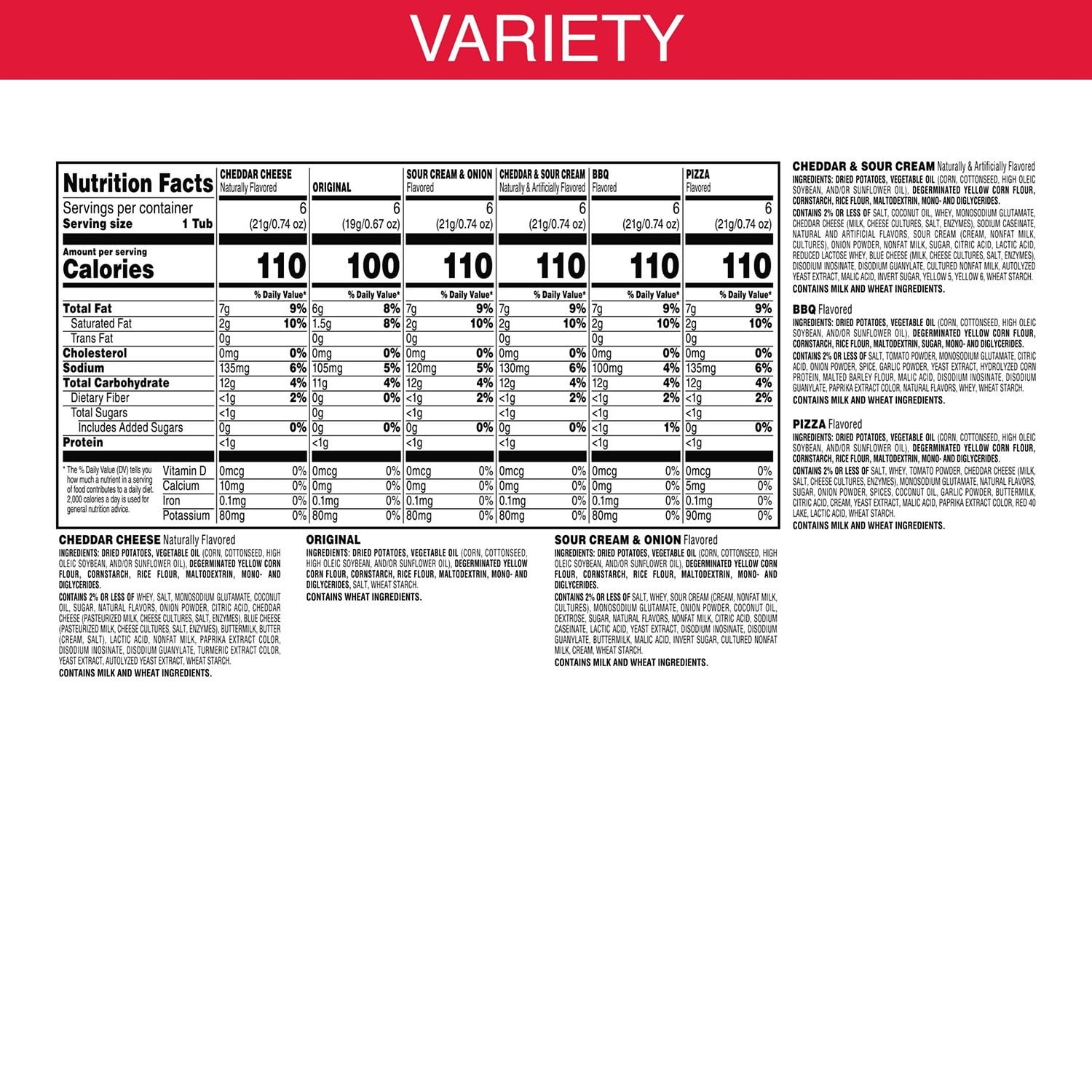 Enjoy the crisp, crunchy, hit-the-spot taste of potato and your choice of 6 delicious flavors. This variety pack includes single-serve cups of Original, Cheddar Cheese, Sour Cream and Onion, BBQ, Cheddar and Sour Cream, and Pizza flavors. Insanely light, crispy and never greasy, they’re bursting with salty, savory flavor. These conveniently sized small cups make it easy to grab and go.