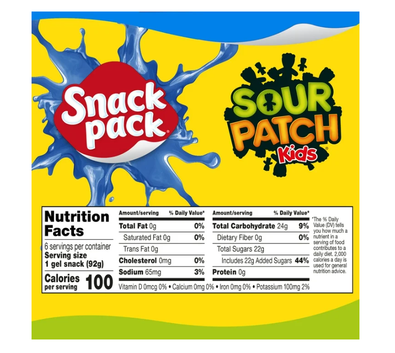 Snack Pack SOUR PATCH KIDS BLUE RASPBERRY Artificially Flavored Juicy Gels are a fun snack or dessert that is delicious any time of the day. This gel snack combines two of your favorite treats to create an exciting snack experience. These snack cups are flavored like delicious BLUE RASPBERRY SOUR PATCH KIDS and deliver an explosion of flavor in every bite. Snack Pack Juicy Gels are so full of flavor, they won’t make you miss the gelatin cups you’ve had before. Not only are these sweet and sour snacks delicious and convenient, but they are gluten free, made with real sugar and contain no high fructose corn syrup. Each Juicy Gels snack cup has 100 calories. Snack Pack Juicy Gels cups are perfect for packing in a lunch so you can cap off your meal with a SOUR THEN SWEET treat. These snack cups also make an easy after-dinner treat or dessert for the entire family. If you want to add some extra excitement to these gels cups, try using them for exciting recipes. Add whipped cream and sprinkles to make fun desserts. Each Snack Pack snack cup is a convenient size and does not need to be refrigerated, making this a reliable treat that is easy to enjoy anytime and easy to pack up and take with you anywhere.