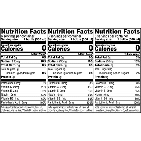 Berry: Water, Citric Acid, Sodium Hexametaphosphate (to Protect Flavor), Natural Flavor, Salt, Potassium Sorbate (Preserves Freshness), Potassium Citrate, Sodium Citrate, Ascorbic Acid (Vitamin C), Sucralose, Acesulfame Potassium, Calcium Disodium EDTA (to Protect Flavor), Calcium Pantothenate (Vitamin B5), Niacinamide (Vitamin B3), Vitamin E Acetate, Pyridoxine Hydrochloride (Vitamin B6). Kiwi Strawberry: Water, Citric Acid, Sodium Hexametaphosphate (to Protect Flavor), Natural Flavor, Salt, Potassium Sorbate (Preserves Freshness), Potassium Citrate, Sodium Citrate, Ascorbic Acid (Vitamin C), Sucralose, Acesulfame Potassium, Calcium Disodium EDTA (to Protect Flavor), Calcium Pantothenate (Vitamin B5), Niacinamide (Vitamin B3), Vitamin E Acetate, Pyridoxine Hydrochloride (Vitamin B6). Grape: Water, Citric Acid, Sodium Hexametaphosphate (to Protect Flavor), Natural Flavor, Salt, Potassium Sorbate (Preserves Freshness), Potassium Citrate, Sodium Citrate, Ascorbic Acid (Vitamin C), Sucralose, Acesulfame Potassium, Calcium Disodium EDTA (to Protect Flavor), Calcium Pantothenate (Vitamin B5) Niacinamide (Vitamin B3), Vitamin E Acetate, Pyridoxine Hydrochloride (Vitamin B6).