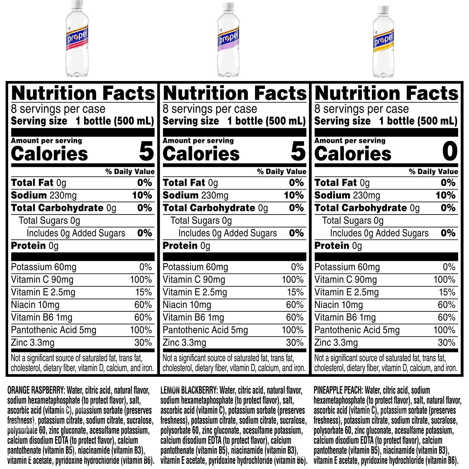 Lemon Blackberry Ingredients: Water, Citric Acid, Natural Flavor, Sodium Hexametaphosphate (To Protect Flavor), Salt, Ascorbic Acid (Vitamin C), Potassium Sorbate, (Preserves Freshness), Potassium Citrate, Sodium Citrate, Sucralose, Polysorbate 60, Zinc Gluconate, Acesulfame Potassium, Calcium Disodium EDTA (To Protect Flavor), Calcium Pantothenate (Vitamin B5), Niacinamide (Vitamin B3), Vitamin E Acetate, Pyridoxine Hydrochloride (Vitamin B6).