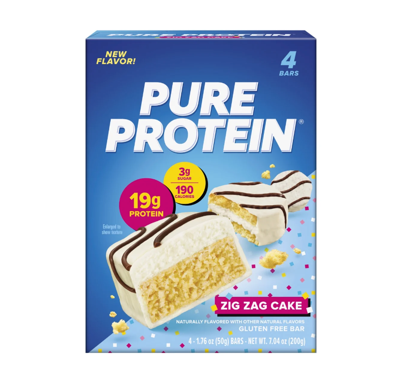 Pure Protein Zig Zag Cake Protein Bars are delicious, high-protein snacks with high-quality protein that supports building lean muscle and strength. Each protein bar contains 19 grams of protein, 190 calories, and 3 grams of sugar to support your busy and active lifestyle. Grab a Pure Protein bar for high-quality protein, an essential part of a nutritious, balanced diet. With delicious vanilla cake and milk chocolate frosting flavor, these high protein bars are a treat at any time of day. Whether you prefer protein bars pre-workout, post-workout, or on-the-go, Pure Protein is proud to offer you high-protein snack bars with low sugar (1) and great taste that you’ll love. (1) Pure Protein products contain 5g of sugar or less. • New Flavor! Pure Protein Bar, Zig Zag Cake, 19g Protein, 1.76 oz, 4 Ct • Enjoy these low sugar (1) protein bars as a convenient protein snack • Contains 19 grams of protein, 190 calories, and 3 grams of sugar • Protein bars with whey protein isolate support lean muscle and strength, as well as an active lifestyle • These protein snack bars offer delicious vanilla cake and milk chocolate frosting flavor with every bite • Gluten Free