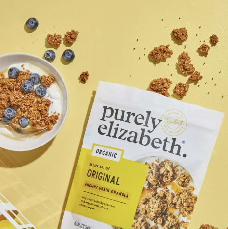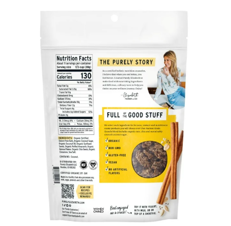 • Purely Elizabeth's Original Ancient Grain Granola is lightly sweetened with organic coconut sugar and added cinnamon and sea salt for a delicious and nutritious classic granola blend. Enjoy these crunchy granola clusters with milk, yogurt, on top of a smoothie or straight out of the bag! • NUTRIENT RICH INGREDIENTS: Made with nutrient-packed quinoa, amaranth, and chia for an elevated nutrient-dense snack, you can feel good about! • LIGHTLY SWEETENED WITH COCONUT SUGAR: Prepared with unrefined coconut sugar, a low-glycemic sweetener that won't make you sluggish as the day goes on. • CERTIFIED GLUTEN FREE, VEGAN & NON-GMO: Made with clean and simple ingredients that are free from additives, processed nutrients, and genetically modified organisms. • BAKED WITH COCONUT OIL: We bake our granola with coconut oil instead of canola oil so that your body uses this meal for energy instead of storing it as fat.