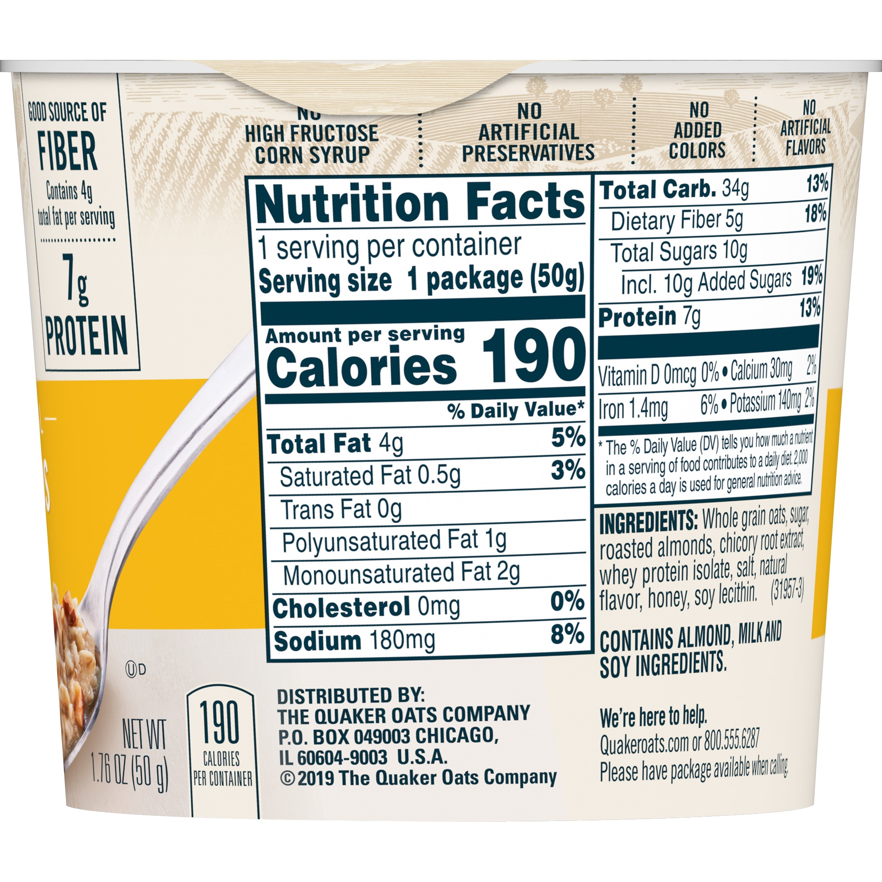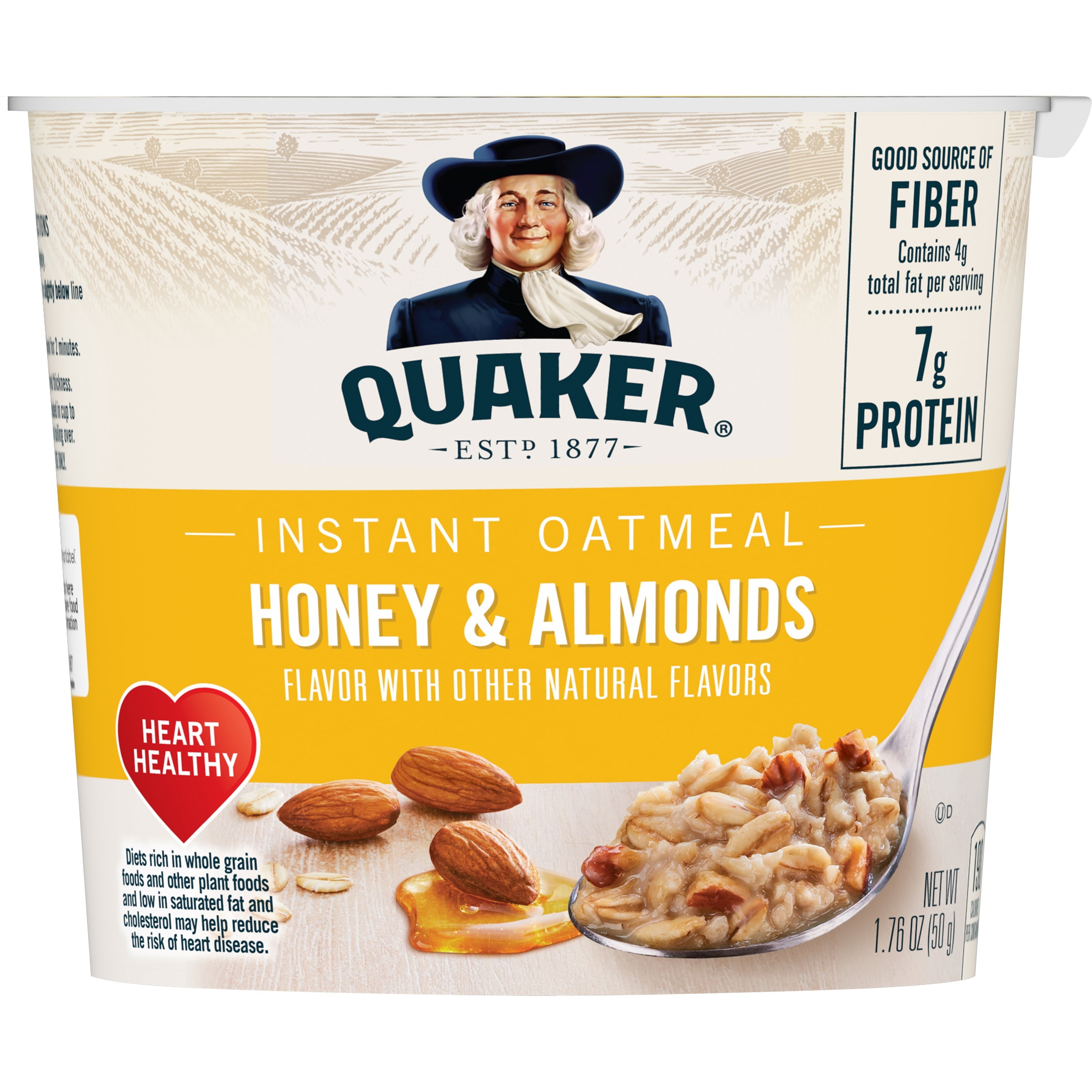 The sweet and nutty flavor of Instant Quaker Oatmeal Honey & Almond Cups makes your morning commute a little easier. With 7 grams of protein, 3 grams of fiber, and 190 calories per serving, it delivers both great taste and balanced nutrition. Enjoy the goodness of 100% whole grains with at least 27 grams per serving and no artificial preservatives, flavors, or colors.