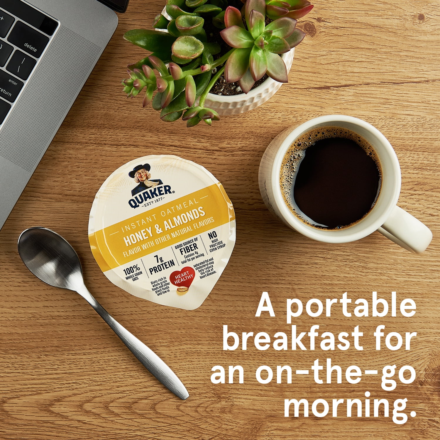 Includes 1 cup (1.76 oz) of Quaker Honey & Almond flavored Instant Oatmeal.