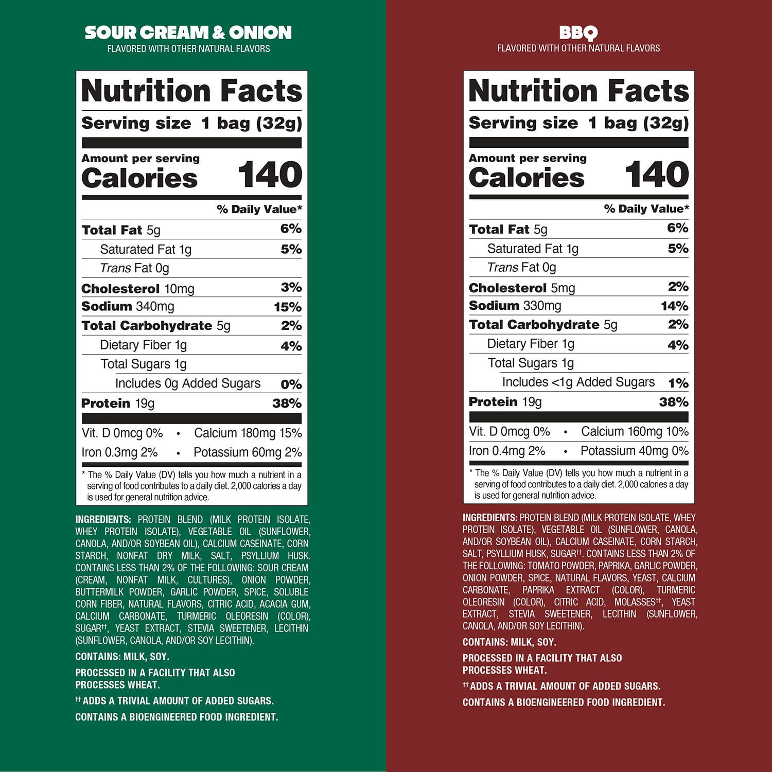 Sour Cream & Onion Ingredients: Protein Blend (Milk Protein Isolate, Whey Protein Isolate), Vegetable Oil (Sunflower, Canola, And/Or Soybean Oil), Calcium Caseinate, Corn Starch, Nonfat Dry Milk, Salt, Psyllium Husk Contains Less Than 2% Of The Following: Sour Cream(Cream. Nonfat Milk, Cultures), Onion Powder, Buttermilk Powder, Garlic Powder, Spice, Soluble Corn Fiber, Natural Flavors, Citric Acid, Acacia Gum, Calcium Carbonate, Turmeric Oleoresin (Color) Sugar#, Yeast Extract, Stevia Sweetener, Lecithin (Sunflower, Canola, And/Or Soy Lecithin). Contains: Milk, Soy. Processed In A Facility That Also Processes Wheat.