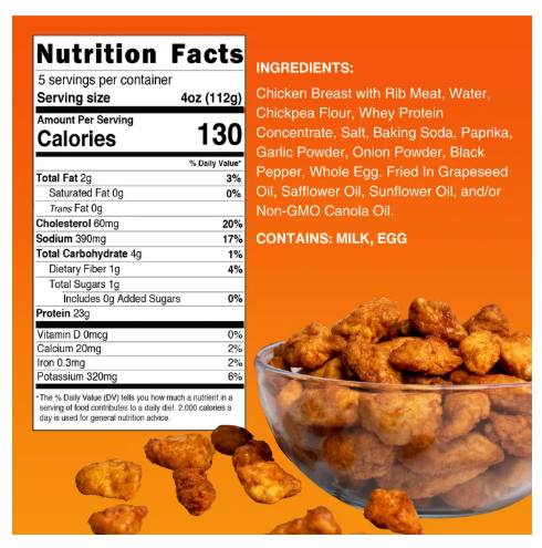 Chicken Breast with Rib Meat, Water, Chickpea Flour, Whey Protein Concentrate, Salt, Paprika, Onion Powder, Garlic Powder, Black Pepper, Whole Egg. Fried in Grapeseed Oil, Safflower Oil, Sunflower Oil, and/or Non-GMO Canola Oil.