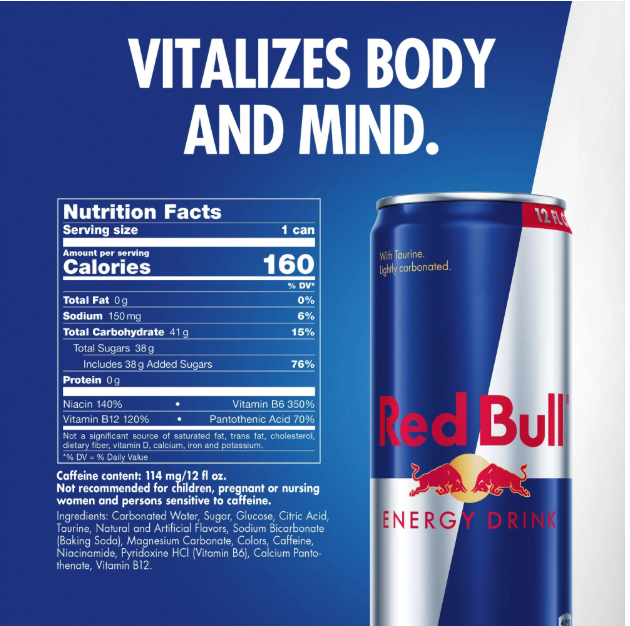 The original energy drink that gives you wiiings, this lightly carbonated beverage is enjoyed worldwide by fitness enthusiasts, athletes, gamers, students and travelers. A refreshing can of Red Bull makes an excellent partner for busy, active lifestyles. Each 12 fl oz can contains 114mg of caffeine per serving and 38g of sugar (comparable to sugar levels found in apple juice). It also includes Taurine, an amino acid naturally occurring in the human body, and B-group vitamins B6, B12, Niacin (B3) and Pantothenic Acid (B5). Available in 4-packs, 12-packs, 24-packs and Variety Packs. Comes in aluminum cans that can be recycled over and over. Always check can labels for most updated product nutritional and ingredient information. Calcium and sugars values declared on labels may vary slightly depending on production locations.