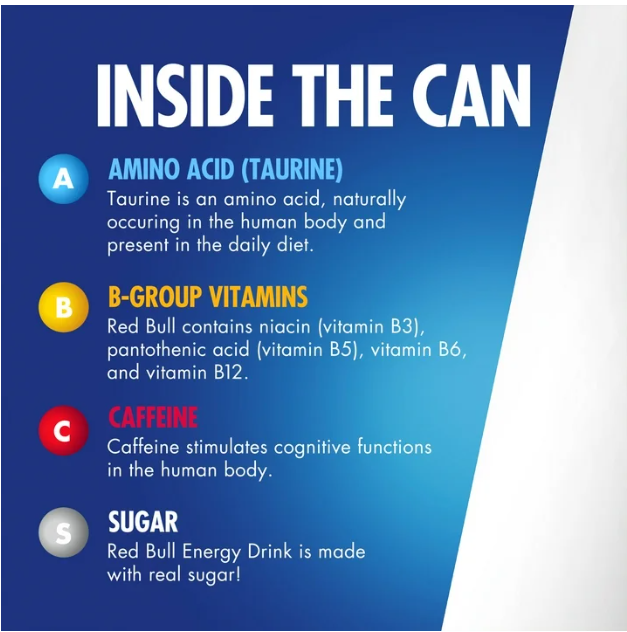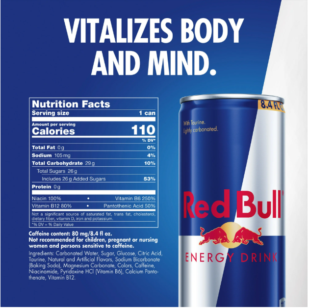 The original energy drink that gives you wiiings, this lightly carbonated beverage is enjoyed worldwide by fitness enthusiasts, athletes, gamers, students and travelers. A refreshing can of Red Bull makes an excellent partner for busy, active lifestyles. Each 8.4 fl oz can contains 80mg of caffeine per serving (about the same amount as a home-brewed cup of coffee) and 26g of sugar (comparable to sugar levels found in apple juice). It also includes Taurine, an amino acid naturally occurring in the human body, and B-group vitamins B6, B12, Niacin (B3) and Pantothenic Acid (B5). Available in 4-packs, 12-packs, 24-packs and Variety Packs. Comes in aluminum cans that can be recycled over and over. Always check can labels for most updated product nutritional and ingredient information. Calcium and sugars values declared on labels may vary slightly depending on production locations.