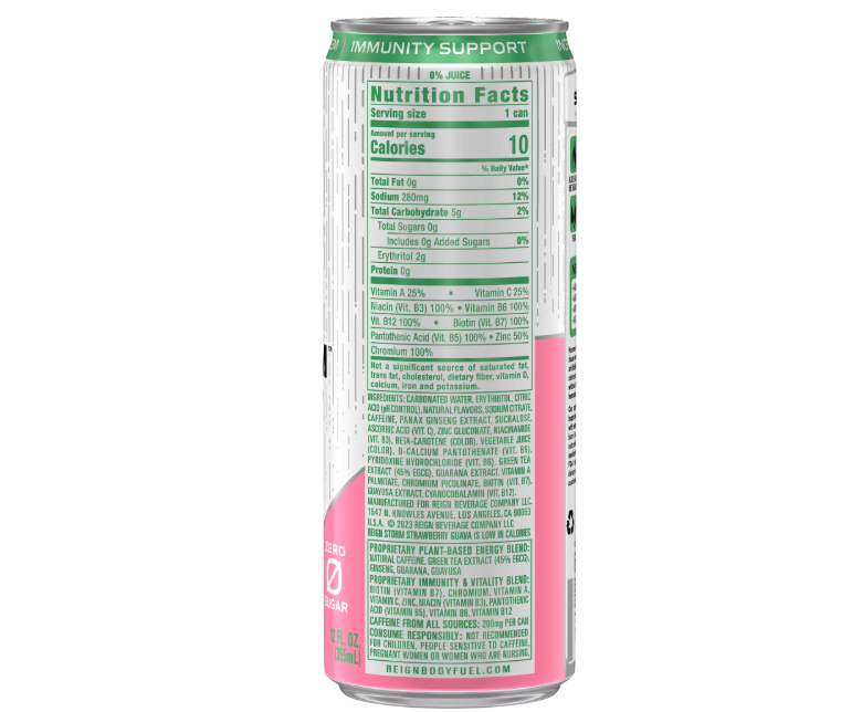 Carbonated Water, Erythritol, Citric Acid (pH control), Natural Flavors, Sodium Citrate, Caffeine, Panax Ginseng Extract, Sucralose, Ascorbic Acid (Vit. C), Zinc Gluconate, Niacinamide (Vit. B3), BETA-Carotene (Color), Vegetable Juice (Color), D-Calcium Pantothenate (Vit. 85), Pyridoxine Hydrochloride (Vit. B6), Green Tea Extract (45% EGCG), Guarana Extract, Vitamin A Palmitate, Chromium Picolinate, Biotin (Vit. B7), Guayusa Extract, Cyanocobalamin (Vit.B12)