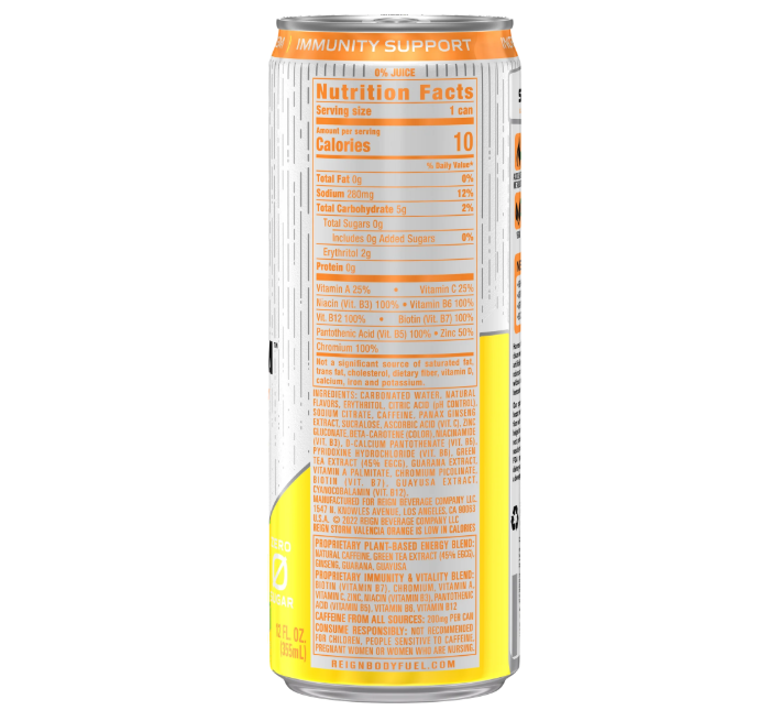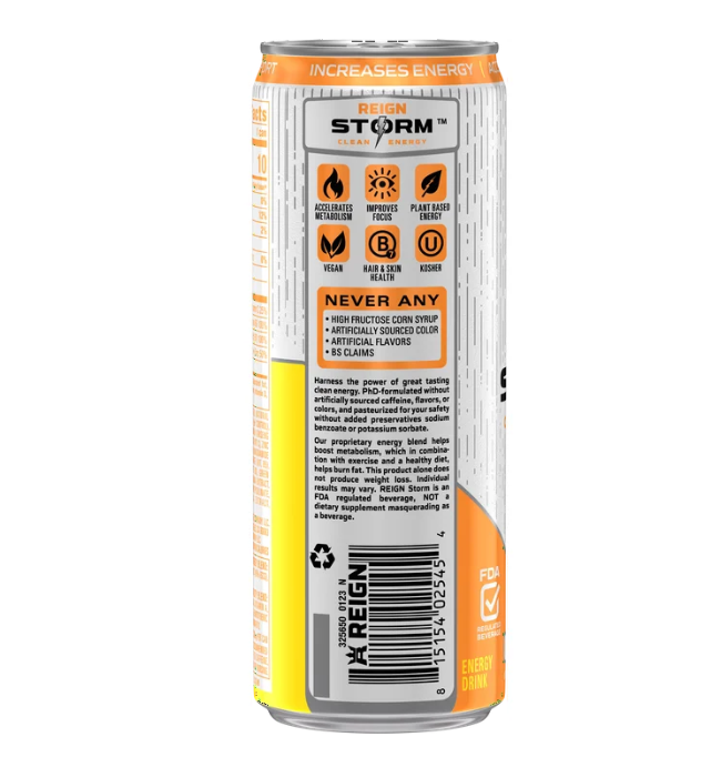 Reign Storm, Valencia Orange, Clean Energy Drink, 12 fl oz Aluminum Can. Introducing REIGN Storm, the perfect storm of flavor and functionality that enhances life’s experience. Available in four amazing flavors, each 12oz slim can contains 200mg of plant-based caffeine, Biotin which aids in healthy skin, hair & nails, loaded with B vitamins, and an immunity blend of Zinc, Vitamin A + Vitamin C – all with ZERO sugar. Get ready to take the world by STORM! Reign Storm Valencia Orange Energy Drink - 12 fl oz Cans.