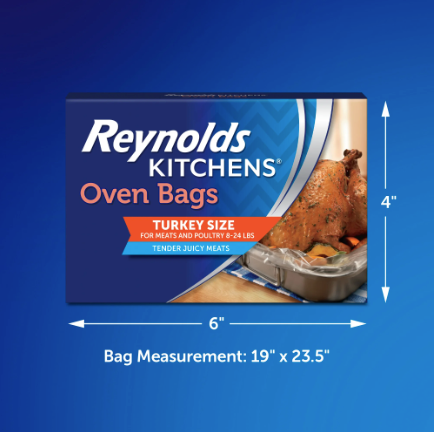 - Reynolds Turkey Oven Bags—This pack includes two, large Reynolds Kitchens Oven Bags, each measuring 19 x 23.5 inches