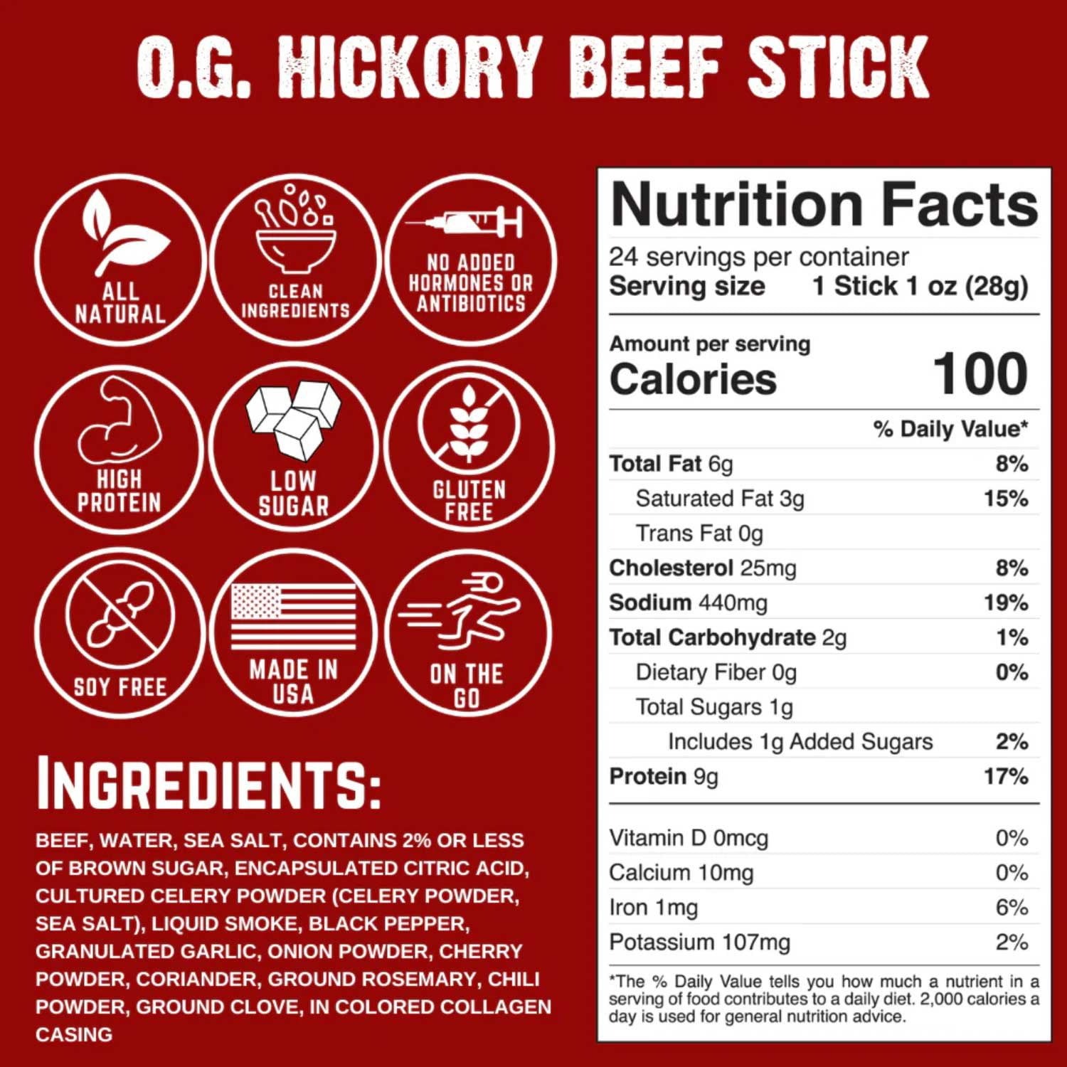 Ingredients: beef, water, sea salt, contains 2% or less of brown sugar, encapsulated citric acid, cultured celery powder (celery powder, sea salt), liquid smoke, black pepper, granulated garlic, onion powder, cherry powder, coriander, ground rosemary, chili powder, ground clove, in colored collagen casing.
