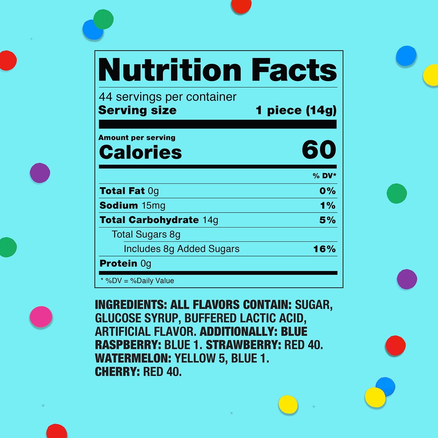 Sour Watermelon: Artificial Flavor, Pear Juice Concentrate, Turmeric (Color), Blue 1.