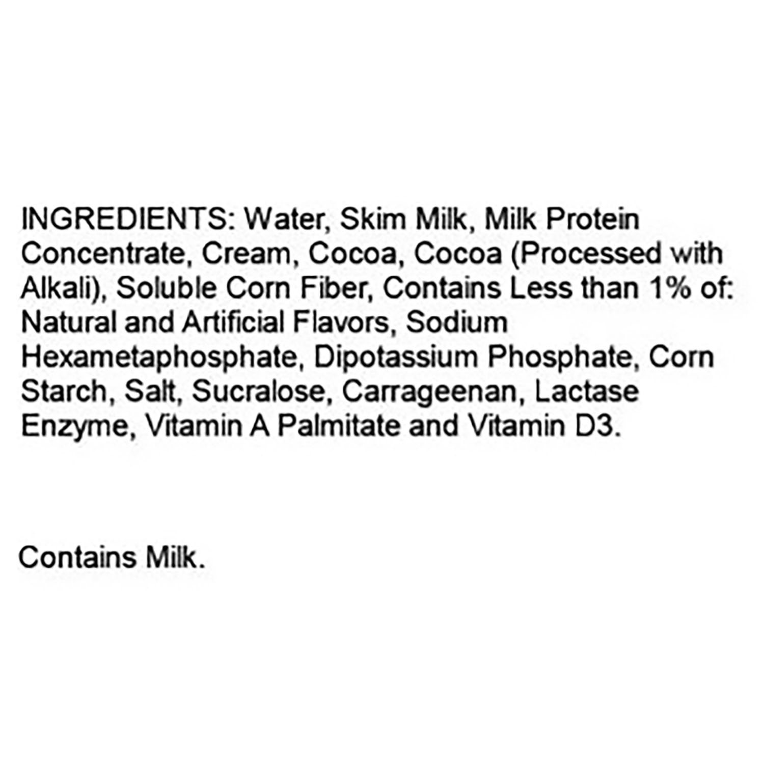 Ingredients: Water, Skim Milk, Milk Protein Concentrate, Cream, Cocoa, Cocoa (processed with Alkali), Soluable Corn Fiber, Contains less than 1% of: Natural and Artificial flavors, Sodium Hexametaphosphate, Dipotassium Phosphate, Corn Starch, Salt, Sucralose, Carrageenan, Lactase Enzyme, Vitamin A Palmitate and Vitamin D3.