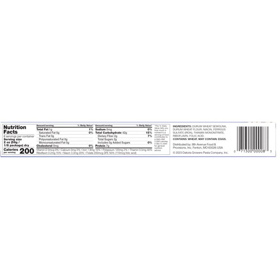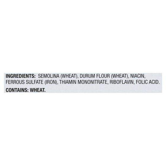 Durum Wheat Semolina, Durum Wheat Flour, Niacin, Ferrous Sulfate (Iron), Thiamin Mononitrate, Riboflavin, Folic Acid.
