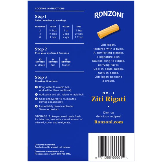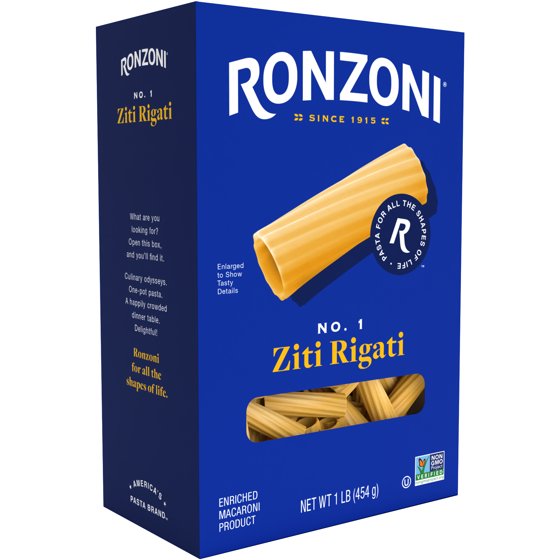 Ronzoni Ziti Rigati, Ridged Tubed Pasta, Non-GMO, (Shelf Stable), 16 oz
