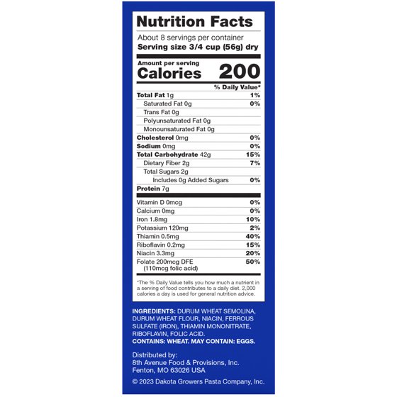 Semolina (Wheat), Durum Flour (Wheat), Niacin, Ferrous Sulfate (Iron), Thiamin Mononitrate, Riboflavin, Folic Acid.