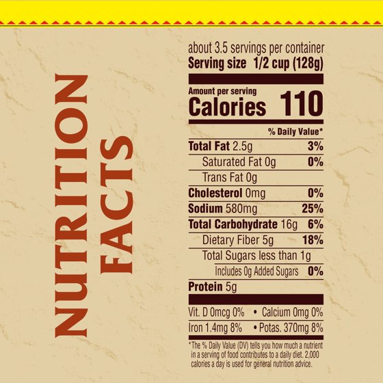 Cooked Beans, Water, Less than 2% of: Canola Oil, Salt, Distilled Vinegar, Potassium Salt, Sea Salt, Chili Pepper, Onion Powder, Spices, Natural Flavor, Garlic Powder. MAY CONTAIN: SOY.