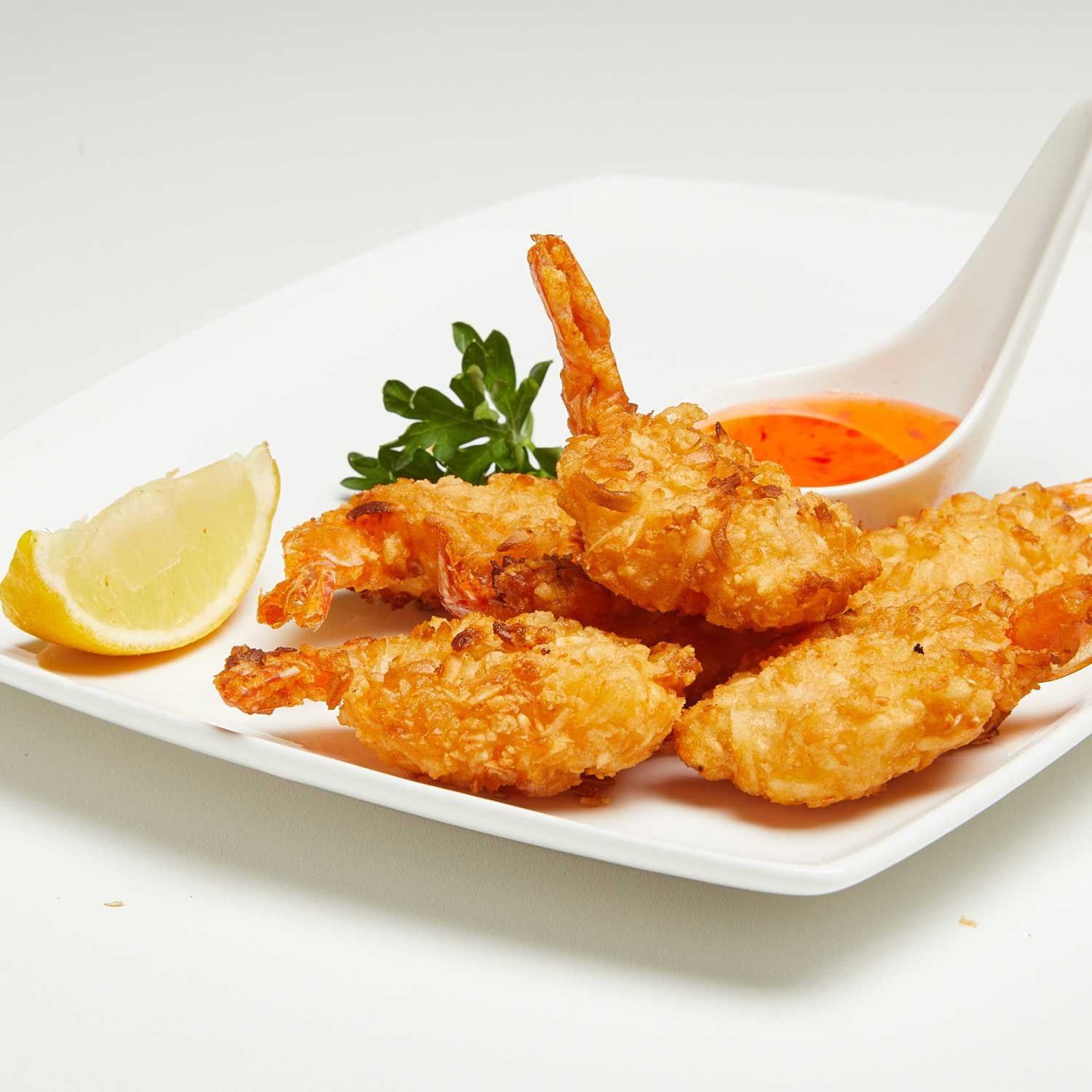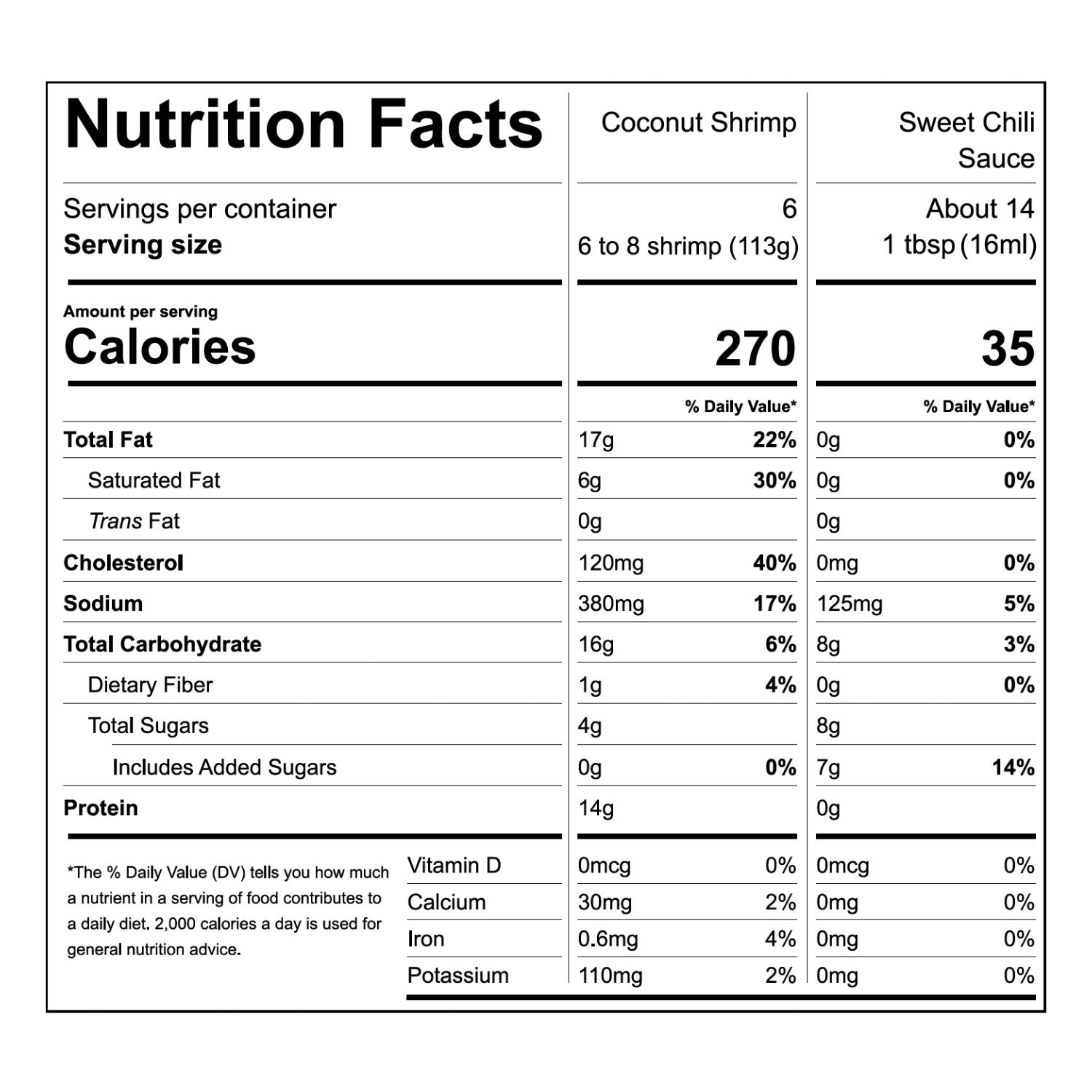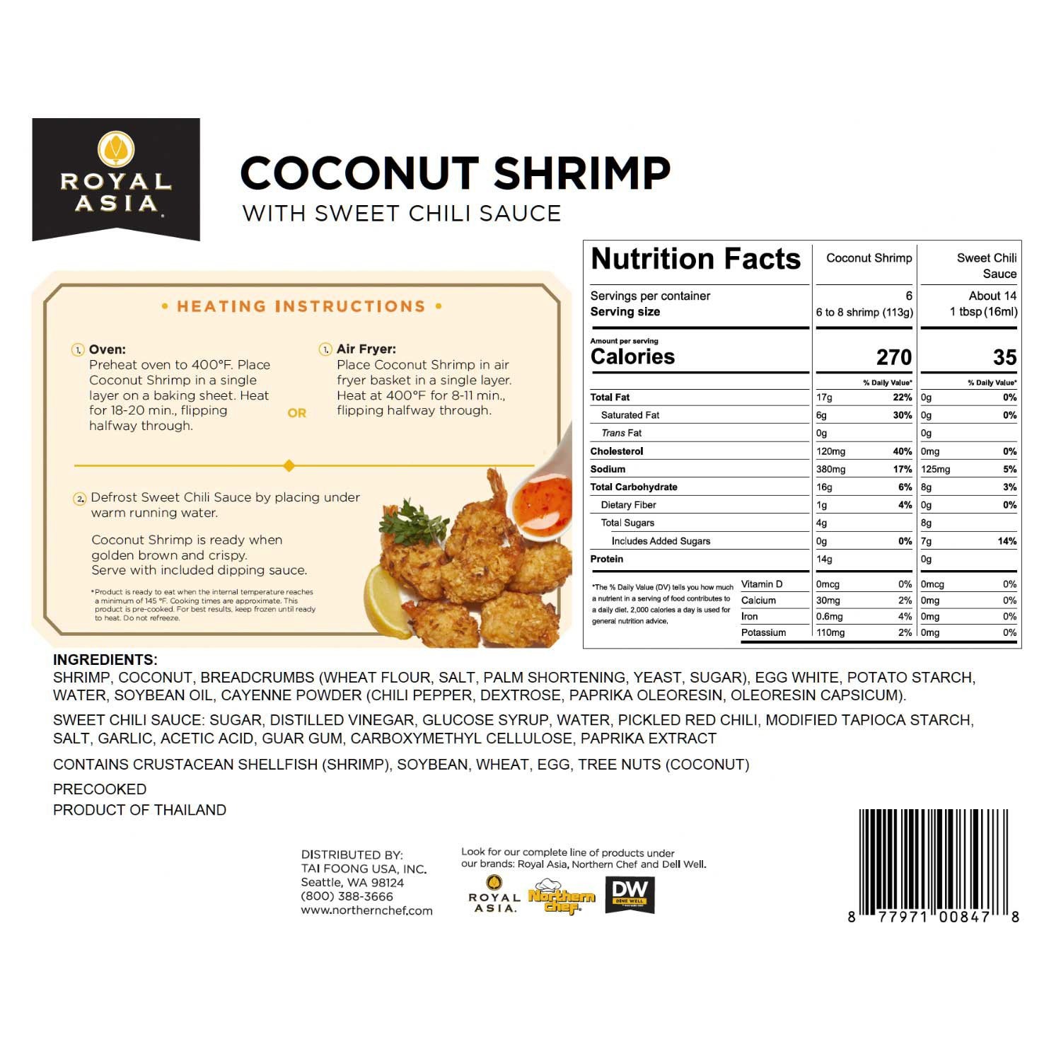 Ingredients: Shrimp, Coconut, Breadcrumbs (Wheat Flour, Salt, Palm Shortening, Yeast, Sugar), Egg White, Potato Starch, Water, Soybean Oil, Cayenne Powder (Chili Pepper, Dextrose, Paprika Oleoresin, Oleoresin Capsicum). Sweet Chili Sauce: Sugar, Distilled Vinegar, Glucose Syrup, Water, Pickled Red Chili, Modified Tapioca Starch, Salt, Garlic, Acetic Acid, Guar Gum, Carboxymethyl Cellulose, Paprika Extract.