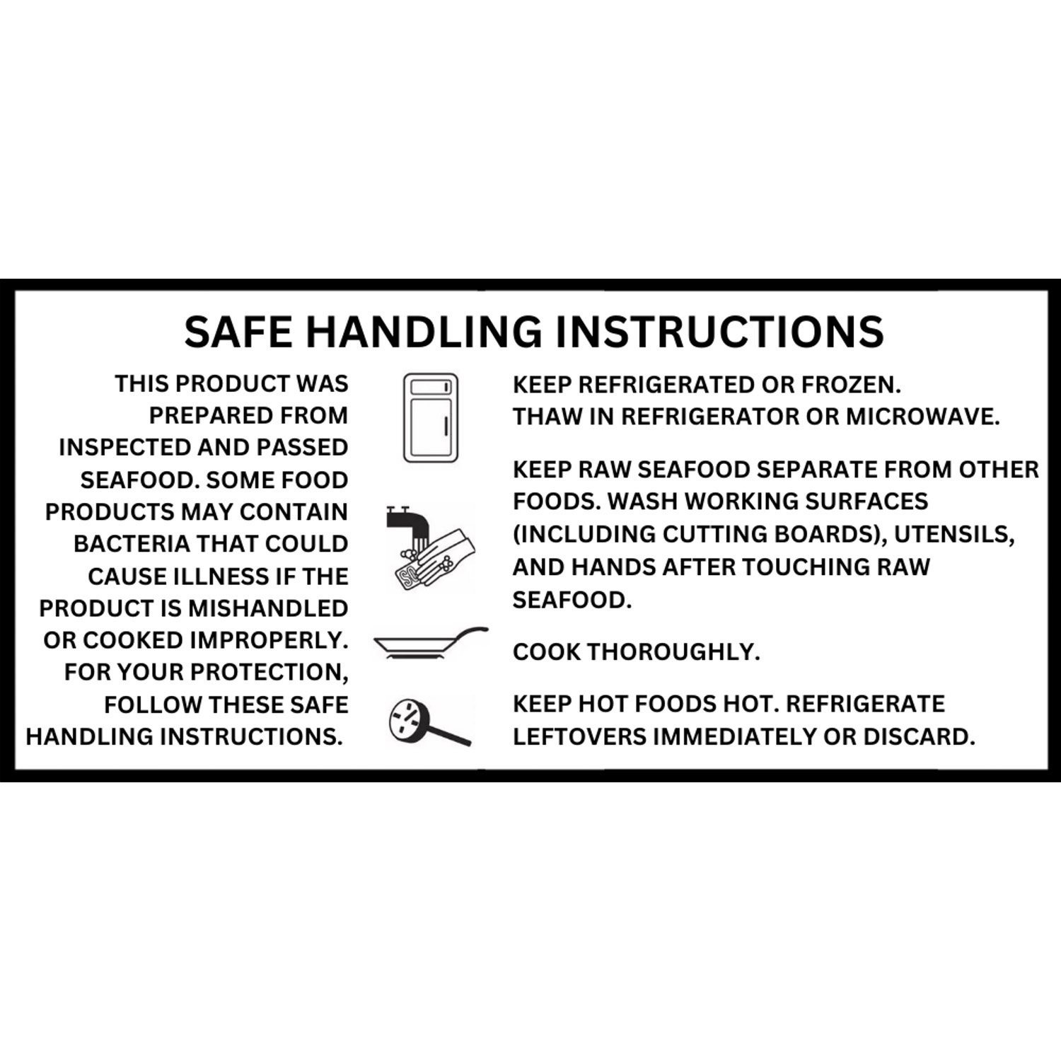 Safe Handling: This product was prepared from inspected and passed seafood. Some food products may contain bacteria that could cause illness if the product is mishandled or cooked improperly. For your protection, follow these safe handling instructions. Keep refrigerated or frozen. Thaw in refrigerator or microwave. Keep raw seafood separate from other foods. Wash working surfaces (including cutting boards), utensils, and hands after touching raw seafood. Cook thoroughly. Keep hot foods hot. Refrigerate leftovers immediately or discard.