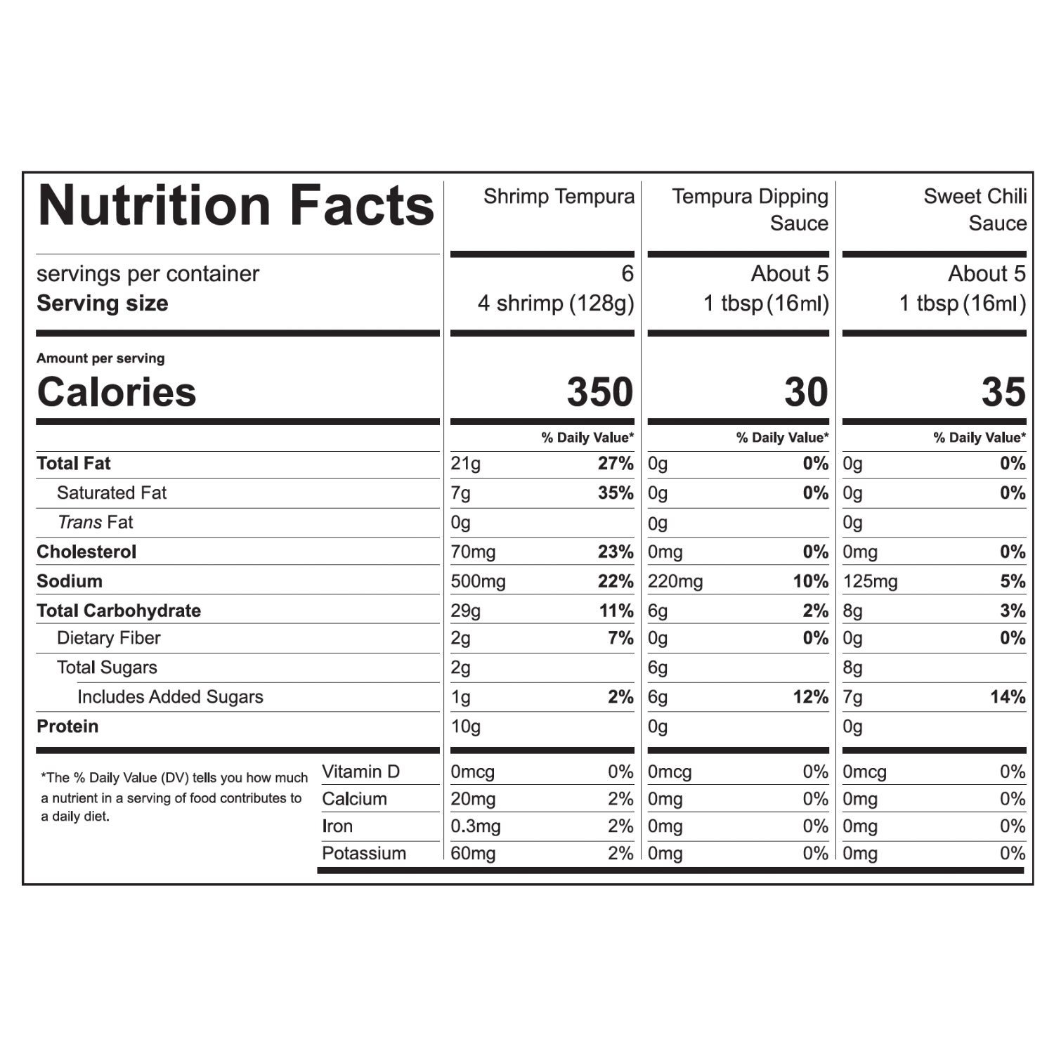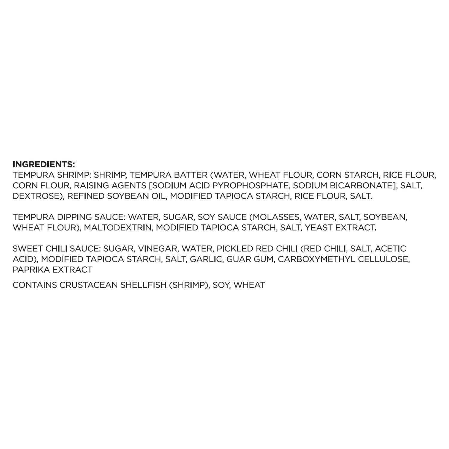 Ingredients: Tempura Shrimp (Shrimp, Tempura Batter (Water, Wheat Flour, Corn Starch, Rice Flour, Corn Flour, Raising Agents (Sodium Acid Pyrophosphate, Sodium Bicarbonate), Salt, Dextrose), Refined Soybean Oil, Modified Tapioca Starch, Rice Flour, Salt), Tempura Sauce (Water, Sugar, Soy Sauce (Molasses, Water, Salt, Soybean, Wheat Flour), Maltodextrin, Modified Tapioca Starch, Salt, Yeast Extract), Sweet Chili Sauce (Sugar, Vinegar, Water, Pickled Red Chili (Red Chili, Salt, Acetic Acid), Modified Tapioca Starch, Salt, Garlic, Guar Gum, Carboxymethyl Cellulose, Paprika Extract).
