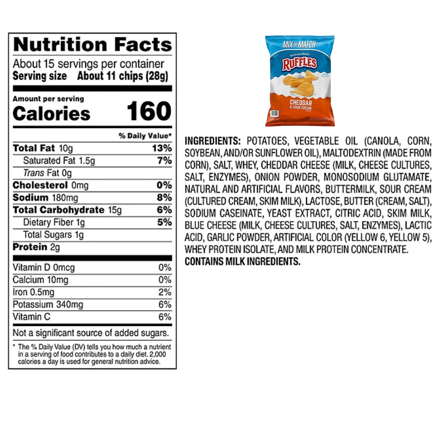 Ingredients: Potatoes, Vegetable Oil (Canola, Corn, Soybean, And/Or Sunflower Oil), Maltodextrin (Made From Corn), Salt, Whey, Cheddar Cheese (Milk, Cheese Cultures, Salt, Enzymes), Onion Powder, Monosodium Glutamate, Natural And Artificial Flavors, Buttermilk, Sour Cream (Cultured Cream, Skim Milk), Lactose, Butter (Cream, Salt), Sodium Caseinate, Yeast Extract, Citric Acid, Skim Milk, Blue Cheese (Milk, Cheese Cultures, Salt, Enzymes), Lactic Acid, Garlic Powder, Artificial Color (Yellow 6, Yellow 5), Whey Protein Isolate, And Milk Protein Concentrate.