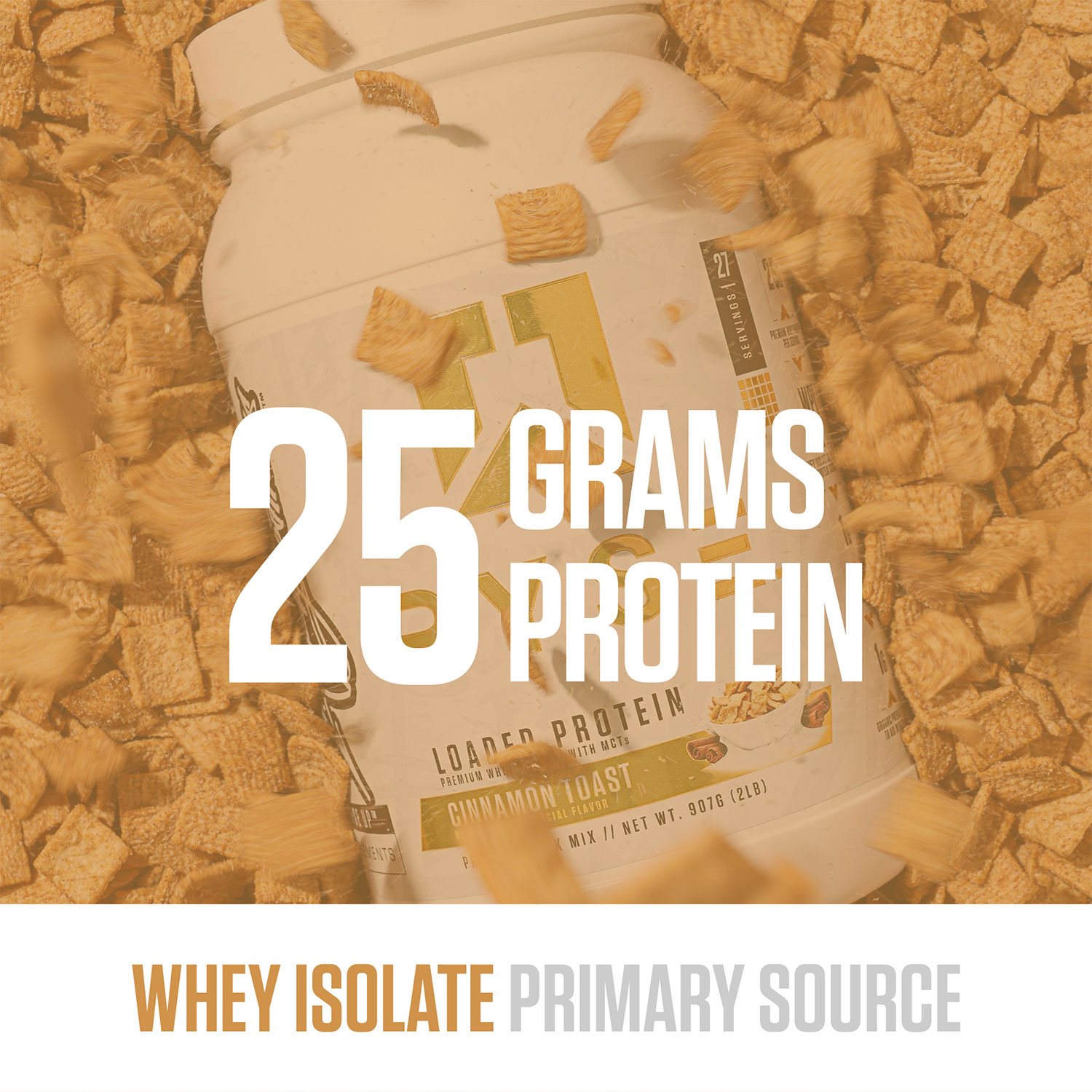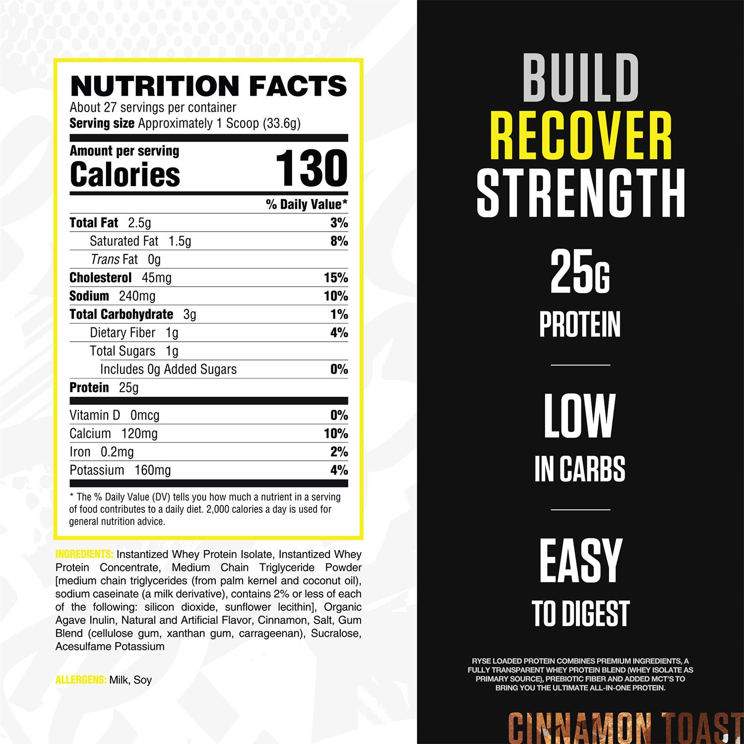 Ingredients: Instantized Whey Protein Isolate, Instantized Whey Protein Concentrate, Medium Chain Triglyceride Powder [medium chain triglycerides (from palm kernel and coconut oil), sodium caseinate (a milk derivative), contains 2% or less of each of the following: silicon dioxide, sunflower lecithin], Organic Agave Inulin, Natural and Artificial Flavor, Cinnamon, Salt, Gum Blend (cellulose gum, xanthan gum, carrageenan), Sucralose, Acesulfame Potassium. Contains Milk, Soy.