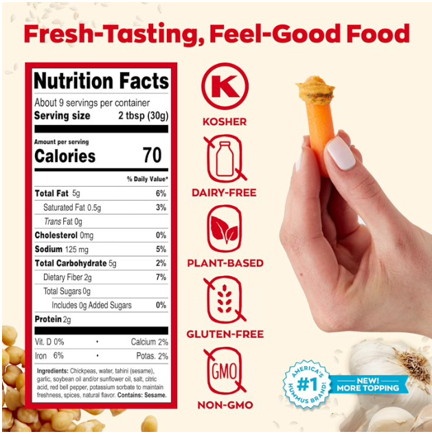 Fresh-Tasting, Feel Good Food: All Sabra® products are cooked in a sealed system, safely protected from contaminants, and we evaluate every single ingredient we use so you can feel good about snacking. Roasted Garlic Hummus is Non-GMO, Gluten-Free, Kosher, Vegan, and Vegetarian.