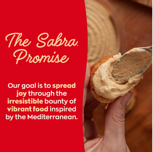 The Sabra® Promise: Our goal is to spread joy through the irresistible bounty of vibrant food inspired by the Mediterranean. We are always on a journey to discover, to be true to ourselves, and to draw people together with rich, immersive and fun experiences.