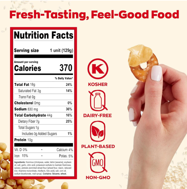 Hummus (Cooked Chickpeas, [Water, Chickpeas], Water, Tahini [Ground Sesame], Soybean Oil, Garlic, Salt, Citric Acid, Potassium Sorbate to Maintain Freshness), Pretzels (Enriched Wheat Flour [Wheat Flour, Niacin, Reduced Iron, Thiamine Mononitrate, Riboflavin, Folic Acid], Salt, Corn Oil, Sodium Bicarbonate, Malt Syrup).