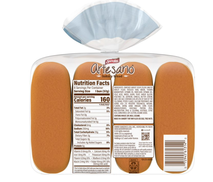 Enriched Wheat Flour [Flour, Malted Barley Flour, Reduced Iron, Niacin, Thiamin Mononitrate (Vitamin B1), Riboflavin (Vitamin B2), Folic Acid], Water, Sugar, Yeast, Wheat Gluten, Vegetable Oil (Soybean, Canola), Butter (Cream, Salt), Sea Salt, Contains 0.5% or Less of Each of the Following: Potato Flakes, Calcium Propionate and Sorbic Acid (to Preserve Freshness), Natural Flavors, DATEM, Grain Vinegar, Corn Flour, Monoglycerides, Vegetable Protein Protein (Pea), Maltodextrin, Spice & Coloring, Dextrose, Citric Acid, Cornstarch, Soy Lecithin, Sesame Seeds.