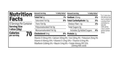 Enriched Wheat Flour [Flour, Malted Barley Flour, Reduced Iron, Niacin, Thiamin Mononitrate (Vitamin B1), Riboflavin (Vitamin B2), Folic Acid], Water, Sugar, Yeast, Vegetable Oil (Soybean), Salt, Calcium Sulfate, Wheat Gluten, Enrichment (Calcium Sulfate, Vitamin E Acetate, Vitamin A Palmitate, Vitamin D3), Preservatives (Calcium Propionate, Sorbic Acid), Monoglycerides, DATEM, Citric Acid, Soy Lecithin, Grain Vinegar.