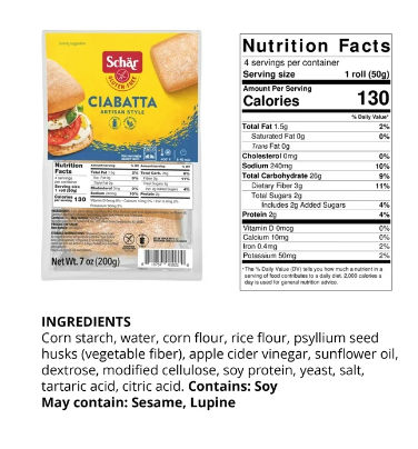 Corn Starch, Water Corn Flour, Rice Flour, Psyllium Seed Husk (Vegetable Fiber), Dextrose, Modified Cellulose, Soy Protein, Sunflower Oil, Yeast, Salt, Tartaric Acid, Citric Acid