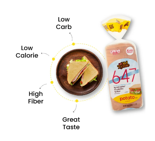 Old Tyme 647 Potato Bread has 8g net carbs*, 50 calories, 9g fiber per serving