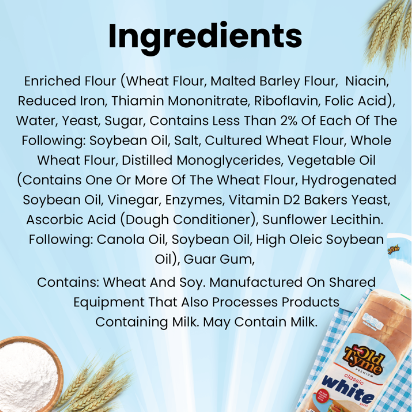 Enriched Flour (Wheat Flour, Malted Barley Flour, Niacin, Reduced Iron, Thiamin Mononitrate, Riboflavin, Folid Acid), Water, Yeast, Sugar, Contains less then 2% of each of the following: Cultured Wheat Flour, Soybean Oil, Salt, Vinegar, Datem, Wheat Flour, Calcium Sulfate, Vegetable Oils (Coconut Oil, Canola Oil, High Oleic Soybean Oil and/or High Oleic Canola Oil), Guar Gum, Whole Wheat Flour, Hydrogenated Soybean Oil, Vitamin D2 Bakers Yeast, Enzymes, Ascorbic Acid (Dough Conditioner), Sunflower Lecithin.