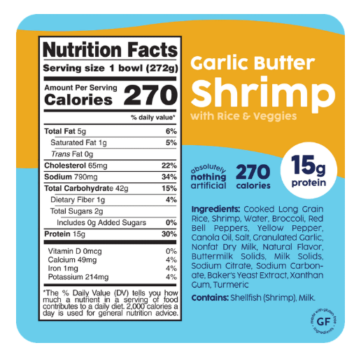 Cooked Long Grain Rice, Shrimp, Water, Broccoli, Red Bell Peppers, Yellow Pepper, Canola Oil, Salt, Granulated Garlic, Nonfat Dry Milk, Natural Flavor, Buttermilk Solids, Milk Solids, Sodium Citrate, Sodium Carbonate, Baker's Yeast Extract, Xanthan Gum, Turmeric Contains: Shellfish (Shrimp), Milk.