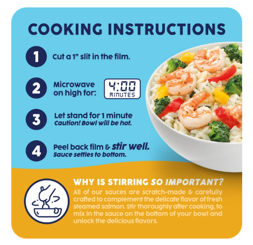 Cook thoroughly **Microwave - From Frozen **1. Cut a 1" slit in the film. **2. Microwave on high, for 3 minutes and 30 seconds. **3. Let stand for 1 minute. Caution! Bowl will be hot. **4. Peel back film, stir thoroughly. **5. Enjoy! **Caution: Food and bowl may be hot! Product must be cooked thoroughly to 165°F for food safety and quality. Do not allow product to thaw. Do not eat without cooking. Directions developed using 1100-watt microwave oven. Appliances vary. Adjust cooking times as needed.