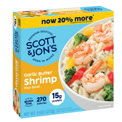 Frozen Shrimp Meal Perfect for Lunch or Dinner – Garlic Butter Shrimp Rice Bowl, Regular, 9.6oz Delicious seafood meals–now 20% more. Scott & Jon’s Garlic Butter Shrimp Rice Bowls now contain 9.6 oz of tender and juicy frozen shrimp, rich garlic butter sauce, crisp broccoli florets, bright bell peppers and long-grain rice. Every bite of this juicy Garlic Butter Shrimp Rice Bowl delivers a burst of garlic butter goodness, exactly what you'd expect and free of any artificial ingredients. Scott & Jon's is redefining seafood meals by creating ethically-sourced shrimp bowls you can truly feel good about. Shrimp Bowls You Can Feel Good About Scott and Jon's are two brothers from Maine with a passion for delicious seafood that’s good for you. Each frozen prepared meal with shrimp is bursting with flavor, higher in nutrition and free of any artificial ingredients. These microwaveable meals are crafted for convenience while elevating health and taste. Each frozen dinner steam cooks fresh and delicious in four minutes in the microwave. With Scott & Jon's, you're getting a shrimp bowl that's quick, easy, and incredibly tasty. Seafood has never tasted so good! Cooking Instructions: 1. Cut a 1” slit in the film. 2. Microwave on high for 4:00 minutes (1100 Watt Microwave).* 3. Let stand for 1 minute. Caution bowl will be hot. 4. Peel back film & STIR THOROUGHLY to mix the sauce. Why is Stirring so Important? All of our sauces are scratch-made & carefully crafted to complement the delicate flavor of fresh steamed shrimp. Stir thoroughly after cooking, to mix in the sauce on the bottom of your bowl and unlock the delicious flavors. *Since appliances vary, these instructions are guidelines only. Alternate cooking instructions are available on the official Scott & Jon's website. Ensure frozen shrimp is cooked thoroughly to 165º F.